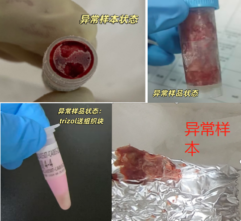 7)凍融組織: 組織凍存后,一旦凍融,核酸降解概率大于 80%,幾乎不可能提取成功,此類組織不建議送樣。請(qǐng)各位老師送樣前注意組織保存狀態(tài), 確保組織未發(fā)生過凍融情況
