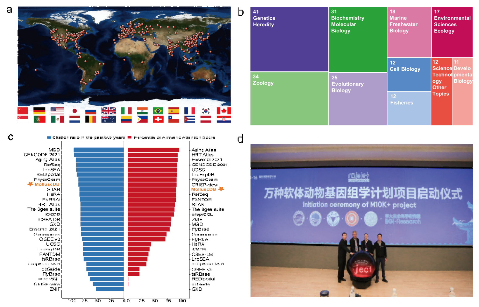圖1-MolluscDB數(shù)據(jù)庫國際影響力(a: 訪問國家;b: 引文領(lǐng)域;c: 數(shù)據(jù)庫排名;d: 國際M10K計(jì)劃啟動(dòng))