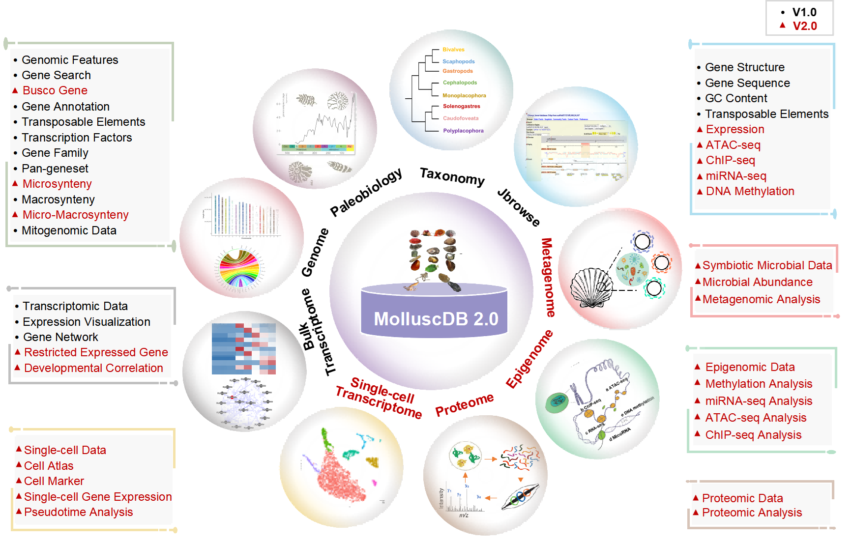 圖3-MolluscDB 2.0數(shù)據(jù)庫架構(gòu)和多組學(xué)功能模塊概覽