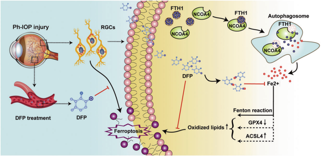 4. ph-IOP導(dǎo)致的鐵代謝紊亂可以通過增加視網(wǎng)膜促鐵死亡因子的表達(dá),減少抑鐵死亡因子的表達(dá)誘導(dǎo)RGC發(fā)生鐵死亡,加重青光眼損傷;去鐵酮口服后可有效通過血-視網(wǎng)膜屏障,ph-IOP損傷后螯合視網(wǎng)膜內(nèi)異常升高的二價鐵,抑制RGCs鐵死亡,保護(hù)視覺功能。