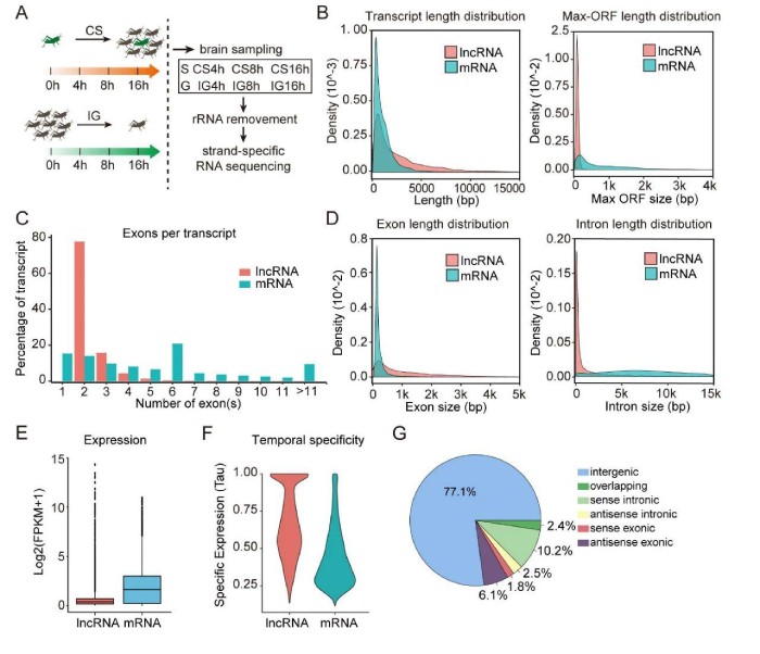 研究發(fā)現(xiàn)大約78%的lncRNA包含2個(gè)外顯子,而mRNA中包含的外顯子數(shù)量為1至120(圖1C)。因此,lncRNA的外顯子明顯長(zhǎng)于mRNA的外顯子(平均長(zhǎng)度1142bpvs.263bp,圖1D,左)。同時(shí),lncRNA的內(nèi)含子明顯短于mRNA的內(nèi)含子(平均長(zhǎng)度:10086bpvs.12442bp,圖1D,右)。表達(dá)水平分析表明,lncRNA的總體表達(dá)水平明顯低于mRNA的表達(dá)水平(平均值為0.6vs.1.9;圖1E)。但是,表達(dá)特異性分析表明,lncRNA的表達(dá)受時(shí)間限制的程度要高于mRNA(平均值為0.672對(duì)0.436圖1F)。基于相對(duì)于mRNA的lncRNA基因組位置,蝗蟲lncRNA被分類為基因間、重疊區(qū)、有義內(nèi)含子、反義內(nèi)含子、有義外顯子和反義外顯子?;认x77%以上的lncRNA是長(zhǎng)基因間的ncRNA(lincRNA,圖1G)。這些結(jié)果表明,蝗蟲lncRNA與mRNA在結(jié)構(gòu)和表達(dá)上有很大不同?;认xlncRNAs更長(zhǎng),具有更少但更長(zhǎng)的外顯子和更短的內(nèi)含子。此外,lncRNA的表達(dá)模式顯示出比mRNA更高的時(shí)間特異性。