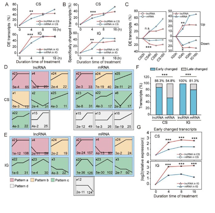 為了進(jìn)一步分析lncRNA和mRNA的表達(dá)模式,使用了短時(shí)間序列表達(dá)挖掘器(ShortTime-seriesExpressionMiner,STEM)對(duì)基于表達(dá)的轉(zhuǎn)錄本進(jìn)行聚類。在CS期間,將214個(gè)lncRNA和242個(gè)mRNA分別分為8個(gè)和9個(gè)重要的表達(dá)譜(圖3D)。其中l(wèi)ncRNA表達(dá)譜15以及mRNA表達(dá)譜15、13和16直到群居化處理后8或16小時(shí)才改變。這些配置文件稱為后期更改的配置文件(模式d)。與后期更改的配置文件相反,早期更改的配置文件以4小時(shí)時(shí)間點(diǎn)開始的轉(zhuǎn)錄表達(dá)變化為特征。根據(jù)4小時(shí)后的表達(dá)變化,將早期變化的輪廓細(xì)分為模式a(早期變化)、模式b(早期中變化)和模式c(可持續(xù)變化)。在IG過程中,269個(gè)lncRNA和639個(gè)mRNA分別聚集成6個(gè)和7個(gè)顯著表達(dá)譜。所有l(wèi)ncRNA配置文件均為早期變化(圖3E)。在mRNA表達(dá)譜中,有6個(gè)是早期改變的,而譜12是晚期改變的。在CS和IG期間,lncRNA的聚類分布圖的數(shù)量與mRNA的分布無明顯差異。但是,通過計(jì)算譜圖中的轉(zhuǎn)錄本數(shù)量,發(fā)現(xiàn)早期改變的lncRNA的百分比比CS中的mRNA的百分比高61.1%(88.3%vs.54.8%,圖3F)。同樣,IG中早期改變的lncRNA的百分比高于IG中的mRNA(100%vs.81.3%,圖3F)。因此,lncRNA比mRNA對(duì)散居化和群居化處理的反應(yīng)更快。在CS中,早期改變的lncRNA的表達(dá)變化速率快于285個(gè)mRNA的表達(dá)變化速率(0.55vs.0.24)和IG(0.77vs.0.39)(圖3G)。因此,早期改變的lncRNA的比例和表達(dá)變化率高于早期改變的mRNA。因此,蝗蟲lncRNA比mRNA對(duì)種群密度的變化更敏感。