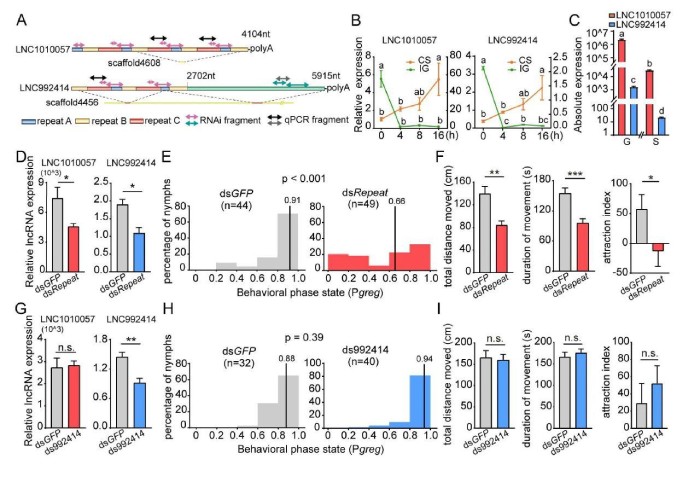 為為了驗(yàn)證LNC1010057和LNC992414在蝗蟲型變中的功能,進(jìn)行了一系列分子生物學(xué)實(shí)驗(yàn)。首先,克隆了在LNC1010057和LNC992414基因座中鑒定出的長(zhǎng)的轉(zhuǎn)錄本。LNC1010057由重復(fù)的A、B和C元素組成,這些元素依次分布并重復(fù)4次,但C元素重復(fù)三次(圖5A)。序列比對(duì)證明LNC992414在5’端與LNC1010057共享相似的重復(fù)序列,但是它們是從不同的基因組基因座轉(zhuǎn)錄而來的(圖5A)。盡管LNC992414的定量表達(dá)水平可以通過特異性引物檢測(cè),但LNC1010057的表達(dá)水平為重復(fù)元件的總表達(dá)水平。如預(yù)期的那樣,LNC1010057和LNC992414的表達(dá)模式極為相似。在CS期間,兩種lncRNA的表達(dá)持續(xù)增加,并且在16h幾乎增加了四倍(圖5B)。在IG期間,4h后表達(dá)水平顯著下降,之后保持相對(duì)穩(wěn)定(圖5B)。LNC1010057和LNC992414之間的序列結(jié)構(gòu)和表達(dá)模式的相似性表明它們是同源的lncRNA。但是,實(shí)時(shí)qPCR分析表明,在散居型和群居型蝗蟲的大腦中,LNC1010057的表達(dá)水平比LNC992414的表達(dá)水平高約1000倍(圖5C)。其次,為了測(cè)試LNC1010057和LNC992414是否參與蝗蟲型變調(diào)節(jié),在通過RNAi抑制蝗蟲大腦中的表達(dá)后進(jìn)行了行為分析。顯著降低LNC1010057的表達(dá)水平(7470對(duì)3764610)和LNC992414(1.9vs.1.0)(圖5D)后行為分析表明,群居型蝗蟲其行為顯著改變?yōu)樯⒕訝顟B(tài)(圖5E)。此外,多個(gè)與型有關(guān)的行為參數(shù)發(fā)生了變化??傄苿?dòng)距離(TDM)和總移動(dòng)持續(xù)時(shí)間(TDMV)顯著降低(圖5F),但是,移動(dòng)速度沒有區(qū)別。同時(shí)群居蝗蟲的特定喜好行為顯著下降(58.3對(duì)-13.5圖5F)。但LNC992414表達(dá)降低并未引起從群居狀態(tài)到散居狀態(tài)的轉(zhuǎn)變(圖5G和H)。與對(duì)照相比,與型相關(guān)的行為參數(shù)(包括運(yùn)動(dòng)和特定物種的優(yōu)選行為)沒有差異(圖5I)。LNC992414的RNAi實(shí)驗(yàn)不會(huì)引起行為變化,因此排除了LNC992414調(diào)節(jié)蝗蟲型變的可能性。這些結(jié)果表明是LNC1010057而不是LNC992414潛在地調(diào)節(jié)了蝗蟲的型變。