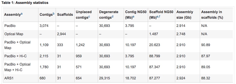 話說回來,既然是技術(shù)貼,咱們還是先來看看組裝策略吧。簡單的說,組裝的方針就是用三代單分子組裝到contig,基于光學(xué)圖譜構(gòu)建scaffold,之后在用HIC構(gòu)建染色體版scaffolds,然后基于RH群體構(gòu)建的遺傳圖去矯正之前組裝的錯誤,最后基于二代短reads補(bǔ)gap。具體的組裝軟件及參數(shù)在文章中的都很明了,小編在此就不贅述了。效果么,直接上表!