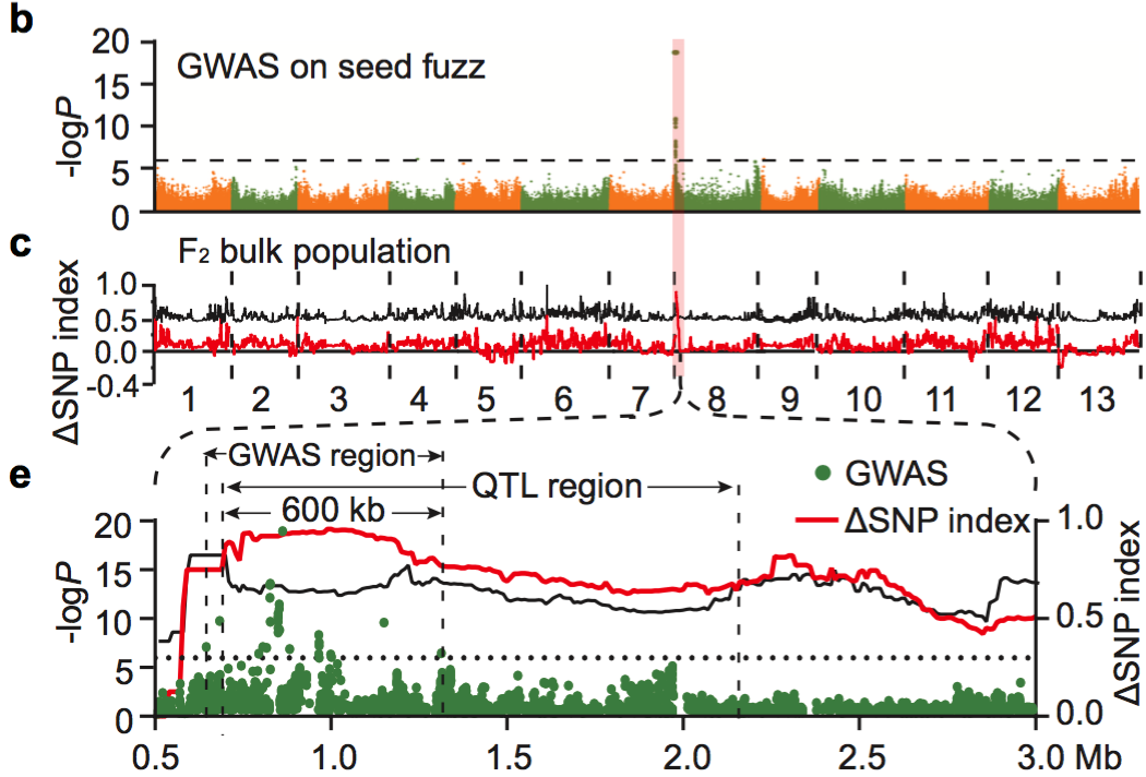 對來自不同環(huán)境下的11個重要性狀進行全基因組關(guān)聯(lián)分析,鑒定了亞洲棉11個重要農(nóng)藝性狀的98個顯著關(guān)聯(lián)位點,GaKASIII的非同義替換(半胱氨酸/精氨酸替換)使得棉籽中的脂肪酸組成(C16:0和C16:1)發(fā)生了變化;發(fā)現(xiàn)棉花枯萎病抗性與GaGSTF9基因的表達激活相關(guān)。選擇了亞洲棉種質(zhì)中的158份有絨毛和57份無絨毛材料進行GWAS關(guān)聯(lián)分析,發(fā)現(xiàn)與毛狀體和纖維發(fā)育有關(guān)信息(圖3)。
