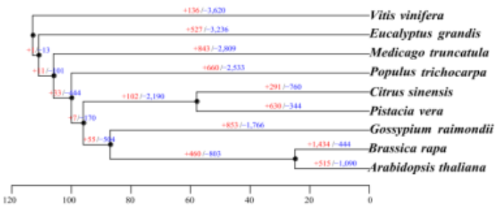 開心果系統(tǒng)進化樹與基因家族收縮擴張分析