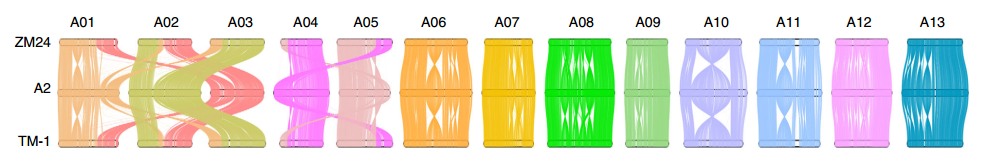 基于 Illumina、PacBio 、Hi-C和光學(xué)圖譜數(shù)據(jù),組裝Arachis monticola(2n = 4x = 40)基因組大小為2.62 Gb ,contigs N50=106.66 Kb,scaffolds N50=124.92 Mb;與栽培四倍體花生A. hypogaea基因組結(jié)構(gòu)變異高度保守,且比野生祖先二倍體更加保守;