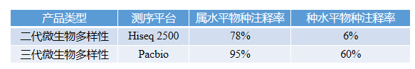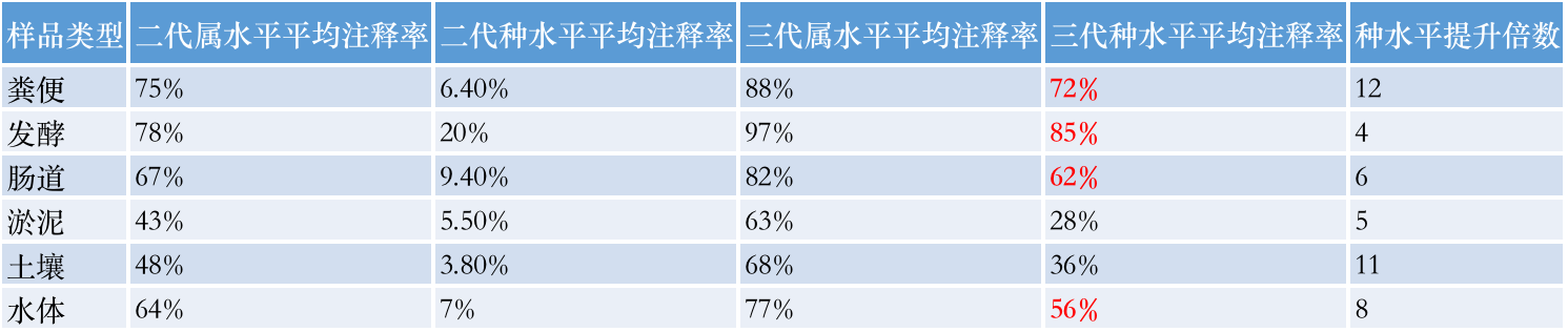 我們對不同類型的樣品如:土壤、糞便、腸道、水體等,隨機(jī)挑選了30個(gè)項(xiàng)目對其進(jìn)行物種注釋率進(jìn)行研發(fā)優(yōu)化,目前采用優(yōu)化數(shù)據(jù)庫及注釋方法的策略,將其種水平平均注釋率提升到60%+。二代注釋到屬和種的平均比例為78%和6%,相同樣品采用三代進(jìn)行注釋時(shí),屬和種水平平均注釋率為95%和60%,注釋結(jié)果提升非常明顯。
