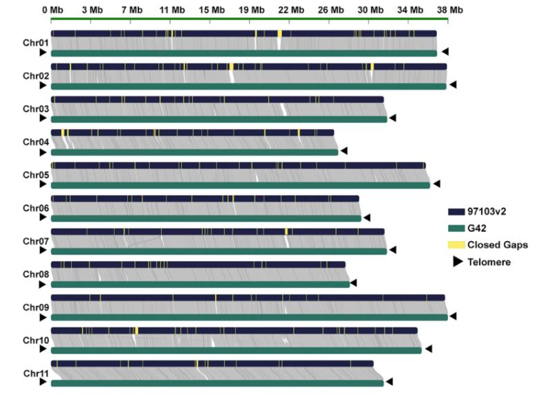 西瓜G42 T2T基因組與97103v2基因組共線性分析 (Deng Y et al., Molecular Plant, 2020)